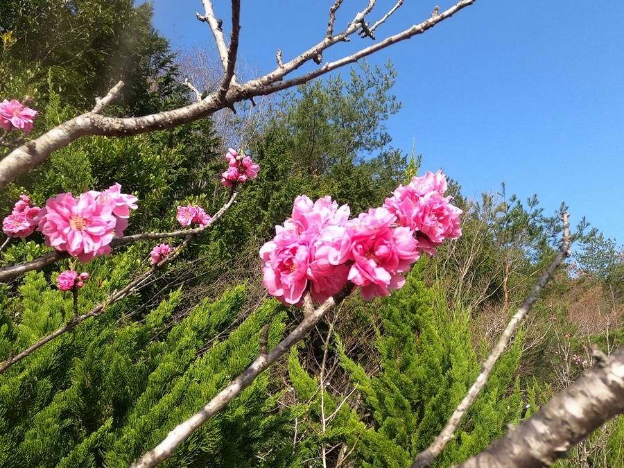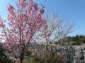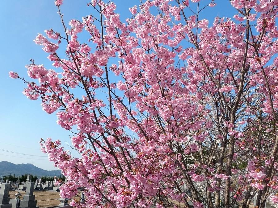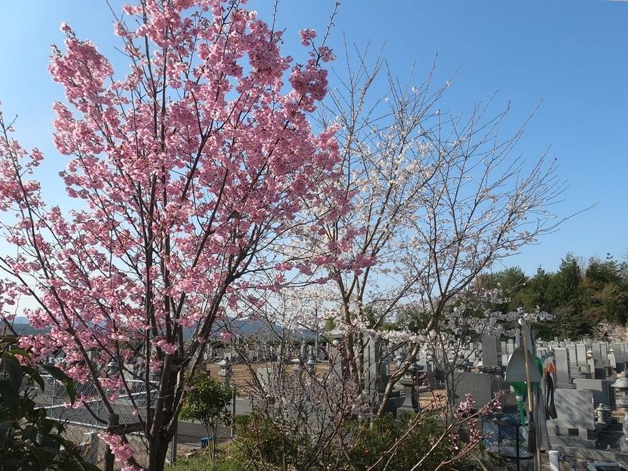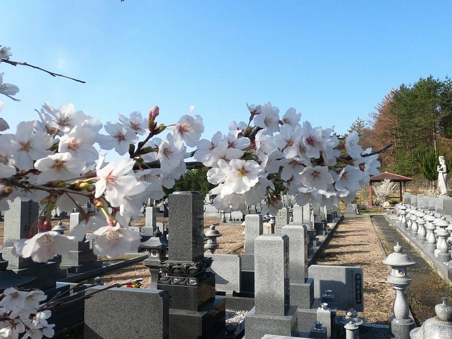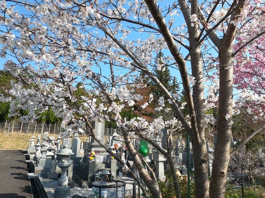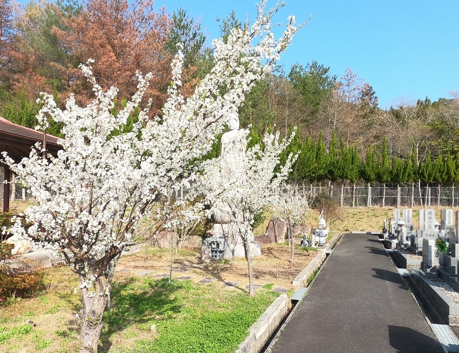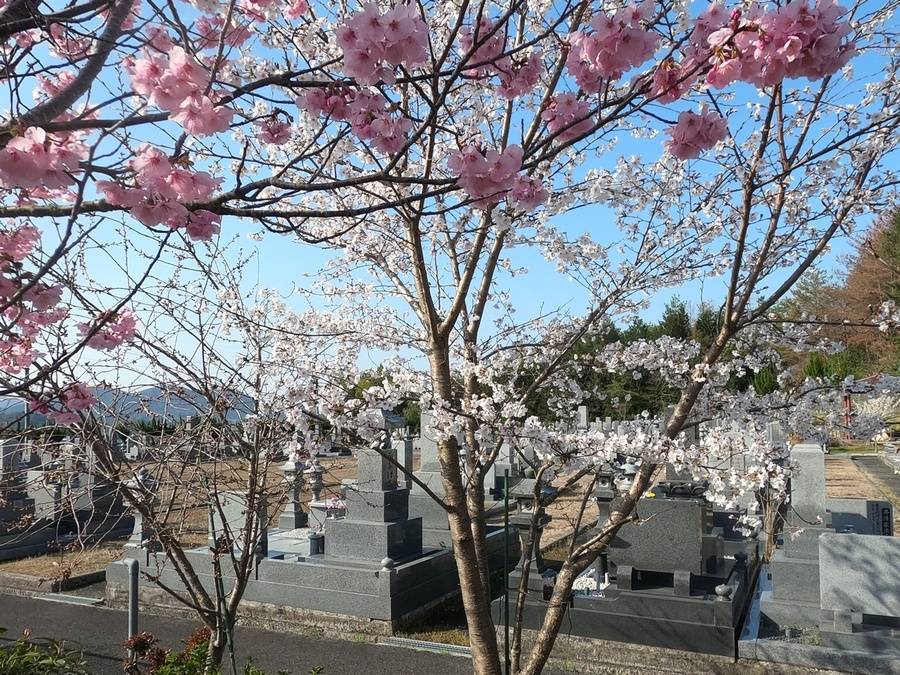 山のふもとに位置し、春の季節には、霊苑内の桜が満開を迎えます。